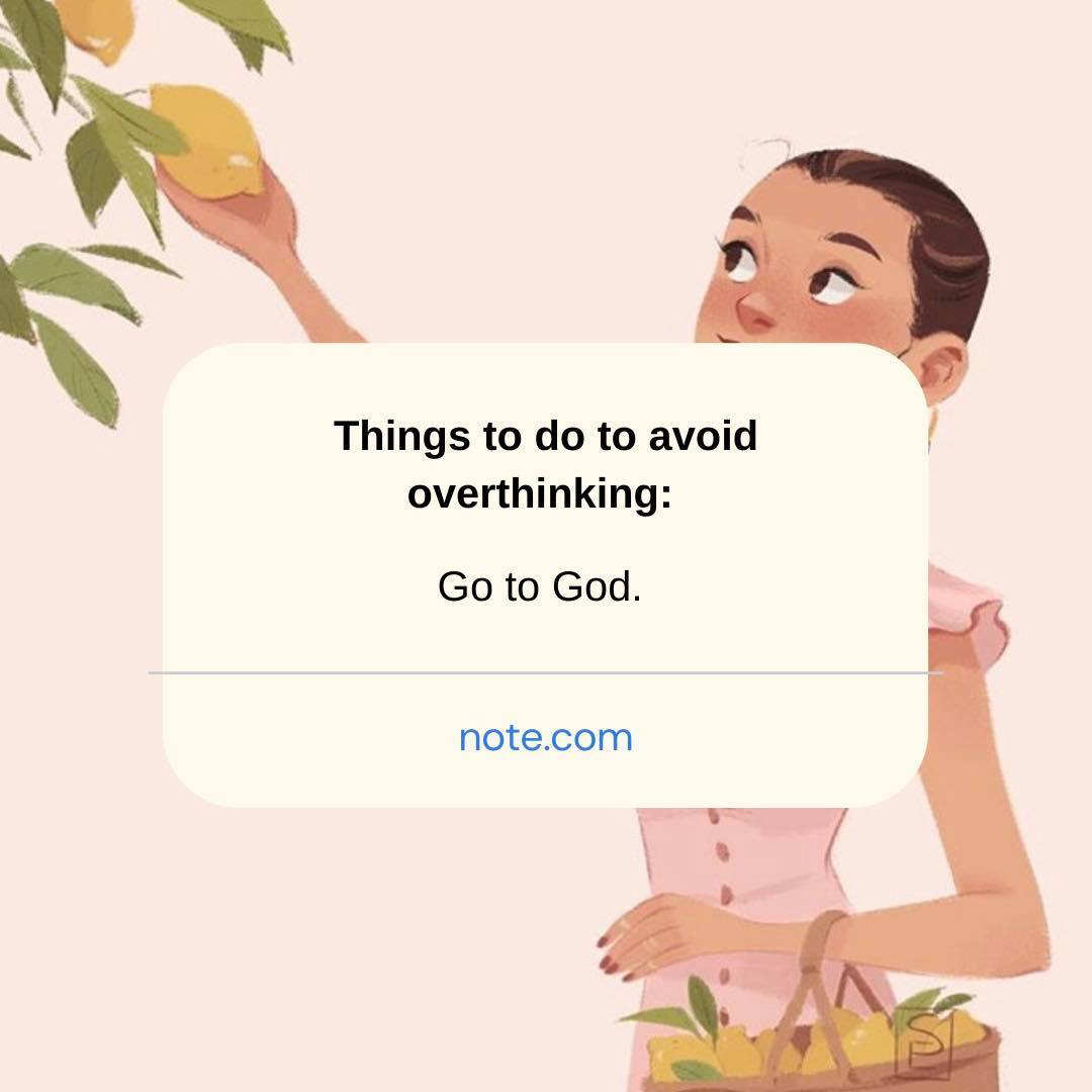 Things to do to avoid overthinking: - Go to God - Avoid negative people. - Talk to someone who will listen without any judgement. - Think how blessed you are and thank God for it.