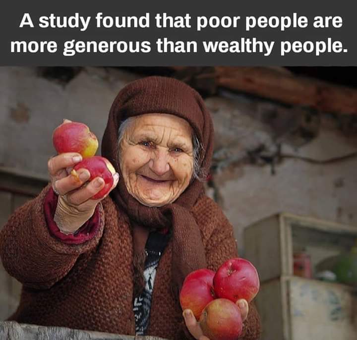 Every one of us can learn valuable lessons from the generosity and compassion of the poor I don’t think it’s right to stereotype and say all poor people are generous or all rich people are stingy. I’ve lived in Indonesia for a few years. My father-in-law does quite well for himself, and could have chosen to live in a huge house, drive a luxury car, etc. Instead, he chooses to help people in his family who aren’t so well off. Many of the poor people I see here, on the other hand, are corrupt, impertinent, and definitely not generous. As an example, my fellow English teacher friend lived with his wife in a gated community and hired a carpenter to do some work on his house. He later found out that the guards at the gate were shaking down the unfortunate carpenter for snacks, cigarettes, etc every morning when he came into work. My friend could do literally nothing about it, since by default as a foreigner he has very little power here. Also, since these guys were guarding the gate to his house, if he called them out, they could perhaps rob his house or let others in who would do so. There’s the example of the poor widow in Mark 12:41-44 who gave her last coin to the temple. She was proportionally more generous than all the rich people. This isn’t a real world example, but at the moment I’m at a loss for real world ones ;P There are plenty of rich people like Bill Gates and J.K. Rowling who donate money to the less fortunate. And there are plenty of rich people who at worst cheat others or at best are very stingy. There are generous poor people and not so generous poor people. Just like anything in life, you shouldn’t generalize. I do have a tendency to think that there is some correlation between inadequate education and poverty, at least in places like Indonesia. Maybe this doesn’t hold for places like the Nordic countries, where a Swedish friend told me a grocery store bagger has a bachelor’s degree. It also seems there is a correlation between more education and being “liberal”. At least in the US, university towns with a more educated population are more “liberal”, while small towns often are populated by “conservatives”. Interestingly, many of these small towns also have lots of poverty, such as the Rust Belt states.
