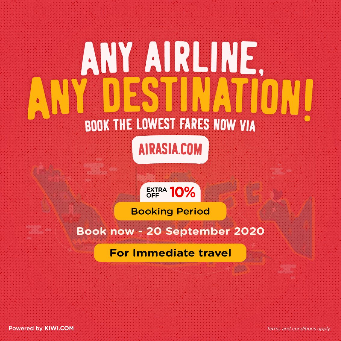 Any Airline, Any Destination Extra discount 10% up to Rp200,000 on any airline and any destination and No promo code required. Booking Period: 10 Sept to 20 Sept 2020 https://invol.co/aff_m?offer_id=101144&aff_id=166212&url=https%3A%2F%2Fflybeyond.airasia.com%2Fid&campaign_id=44173&source=campaign