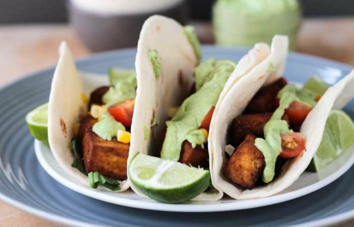 Marinated and baked tofu is a mouth-watering, meat-free alternative stuffing for tacos. Add your favorite toppings, along with creamy homemade cilantro sauce. Servings: 4 Total Time: 1hour 20mins Ingredients Baked Tofu: 1 pound firm tofu (drained) 2 tbsp coconut aminos or soy sauce ½ tsp liquid smoke 1 tbsp smoked paprika 1 tsp cumin ¼ tsp oregano Tortillas (to serve) Creamy Cilantro Sauce: ½ cup raw cashews ½ avocado (peeled and pitted) ¼ cup packed cilantro ¼ tsp garlic powder Freshly squeezed juice 2 limes Salt and ground black pepper (to season) ¼ - ½ cup coconut milk (to thin) Toppings: Tomatoes (diced) Sweet corn kernels (uncooked) Fresh spinach (chopped) Freshly squeezed lime juice Cilantro (chopped, to garnish) Directions: 1. First, press the tofu. Line a plate with kitchen paper towel. Place a drained block of tofu on top of the towel. Using more kitchen towels, cover the tofu. Place then another plate on top of the tofu and weigh it down with bags of dried beans. Press for approximately 20 minutes before cutting into cubes. 2. Preheat the main oven to 400 degrees F. 3. In a ziplock bag, combine the coconut aminos with the liquid smoke, paprika, cumin, and oregano. 4. Add the cubes of tofu to the bag, seal, and mix well until evenly and well coated. Transfer the bag to the fridge for a minimum of 30 minutes. 5. Remove the tofu from the bag, shaking gently to remove any excess marinade. 6. Next, arrange the tofu on a baking sheet lined with parchment paper and bake in the preheated oven for 15 minutes. Flip the cubes over and continue to bake until firm, for 10-15 minutes. 7. While the tofu bakes, prepare the cilantro sauce. 8. Soak the cashews in warm water for 25-30 minutes firstly, then drain. 9. Add the soaked cashews, avocado, cilantro, garlic powder, fresh lime juice, salt, and black pepper (to taste). Puree until silky smooth. In ¼ cup increments, add the coconut milk and blend until you achieved your preferred consistency. 10. To assemble and serve: Arrange the spinach on a tortilla followed by the baked tofu cubes and preferred toppings. 11. Enjoy.