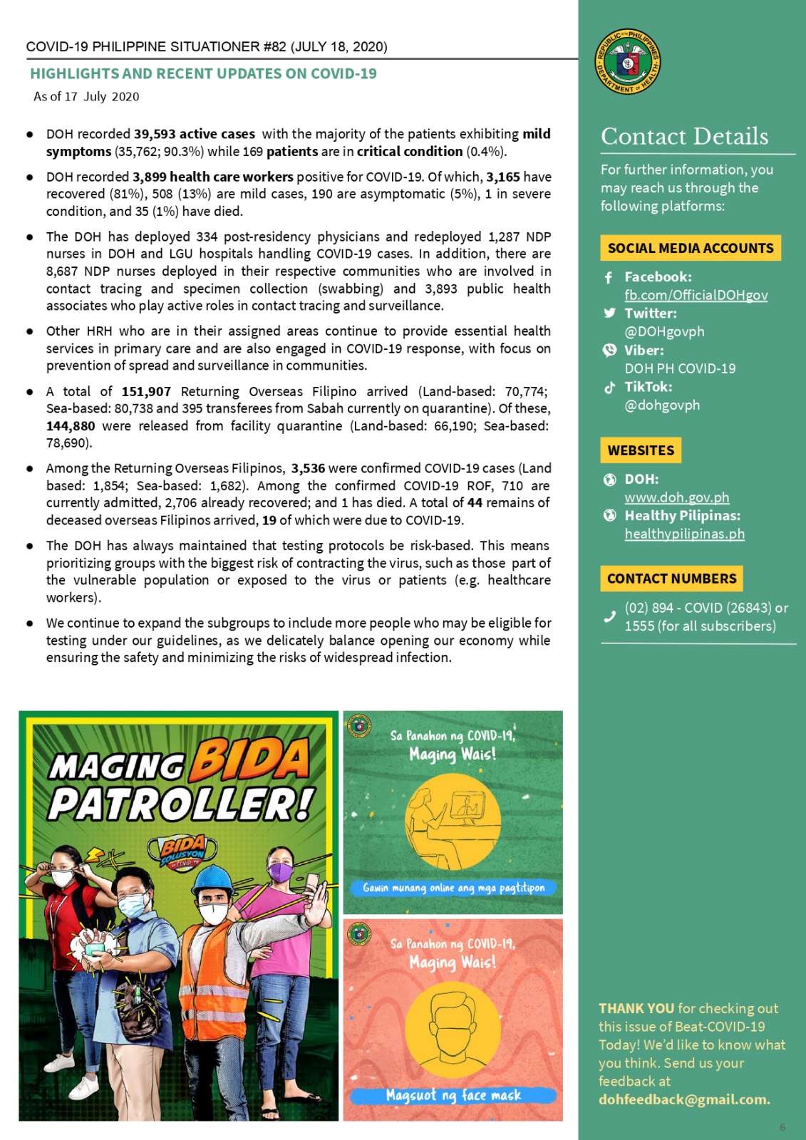 You may now check out the 82nd issue of DOH’s Beat COVID-19 Today: Philippine Situationer! ✨ Click here to view and download 👉🏼 bit.ly/BeatCOVID19PH Note: Data as of yesterday, July 17 #BeatCOVID19 #WeHealAsOne #COVID19PH