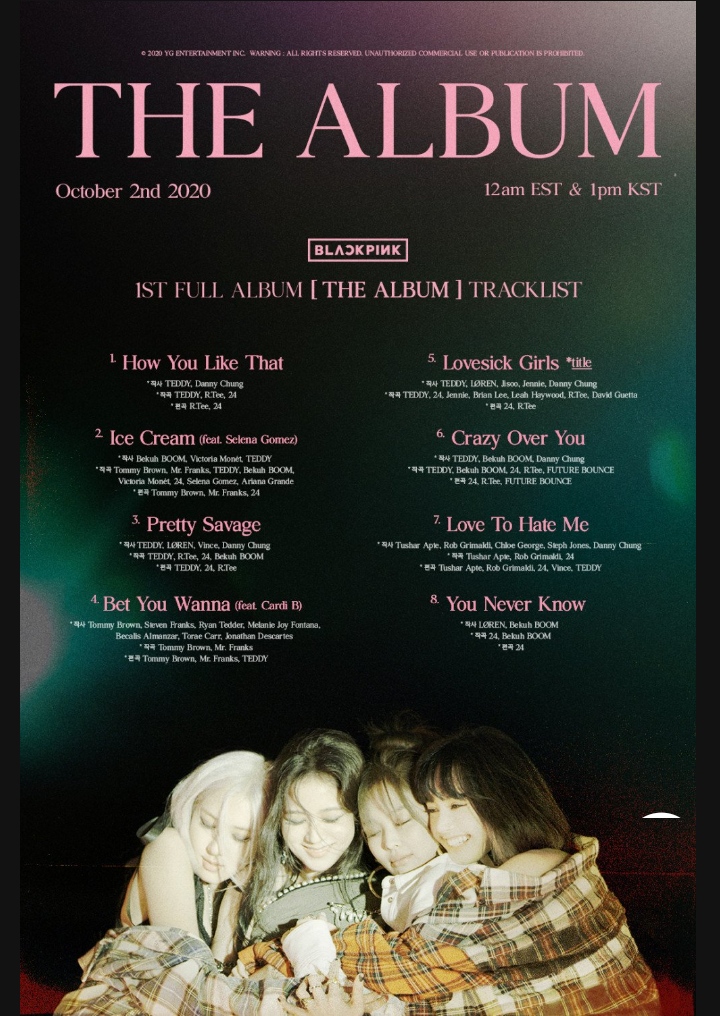 The full tracklist for BLACKPINK's long-awaited 1st full album 'The Album' is here! As you can see below, the BLACKPINK members have loaded up their highly-anticipated new album with a whopping 8-tracks, starting with their two pre-release singles "How You Like That" and "Ice Cream" feat. Selena Gomez. The 6 tracks which follow are brand new, never-before-heard tracks including "Pretty Savage", "Bet You Wanna" feat. Cardi B, the group's comeback title track "Lovesick Girls", "Crazy Over You", "Love To Hate Me", and "You Never Know"! Which song are you looking forward to the most? BLACKPINK's 'The Album' is out worldwide later this week on October 2 at 12 AM EST!