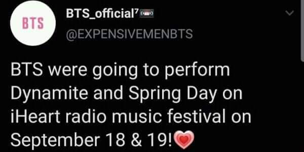 BTS were going to perform Dynamite and Spring day on iHeartRadio music festival on September 18 & 19!! YAAYYY ANOTHER PERFORMANCE OF DYNAMITE AND SPRING DAY!
