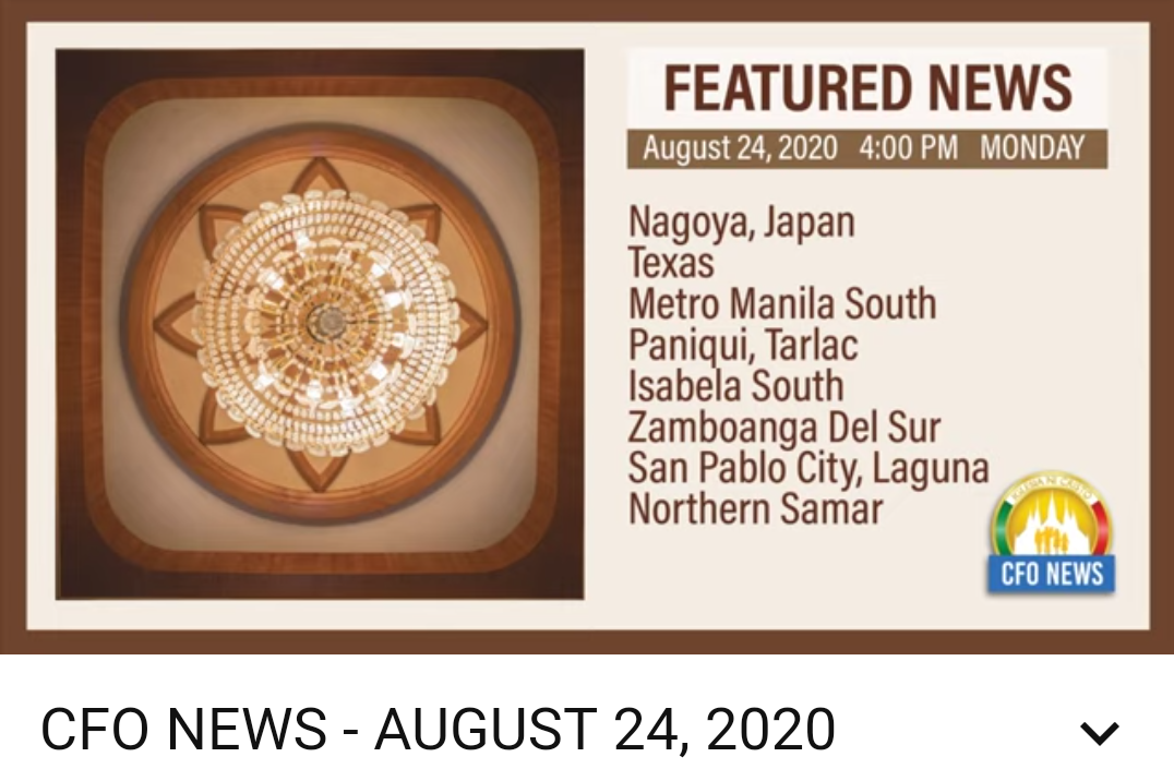 CFO NEWS - AUGUST 24, 2020 45,985 views INC News and Updates 375K subscribers Streamed live on Aug 24, 2020 CFO NEWS - AUGUST 24, 2020 (MONDAY) 1. Nagoya, Japan 2. Texas 3. Metro Manila South 4. Paniqui, Tarlac 5. Isabela South 6. Zamboanga Del Sur 7. San Pablo City, Laguna 8. Northern Samar