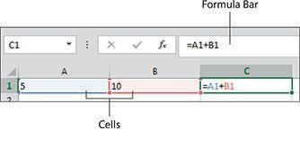 An Excel spreadsheet is simply a collection of cells that you can use to enter data. Each cell is given a name based on its position in the spreadsheet. The top-leftmost cell is called cell A1. It’s the cell located in column A, row 1. When you enter a value in cell A1 (for example, the number 5), that cell’s value becomes 5. If you enter the number 10 in cell B1, that cell’s value becomes 10. You can use then use these values in a formula. For instance, you can click cell C1 and begin typing =A1+B1, as shown in Figure. Note how you can see your formula in both the cell you’re typing in and the Formula Bar above the column headings. Entering a basic formula. After you press the Enter key on your keyboard, Excel recognizes what you’re asking and performs the calculation that gives you the result of 15 (5+10 = 15). The reason Excel recognizes that you were entering a formula and not just another value is the equal sign (=). Entering the equal sign followed by other values tells Excel that you’re starting a formula. In this example, we used what are known as cell references (A1 and B1). These cell references are just one of the types of values that you can use in your formulas. Excel formulas accept the following types of values: • Constants: You can use hard-coded numbers directly in a formula. For example, you can enter =5+10 directly into a cell to get the answer 15. • Operators: These include symbols that perform addition (+), symbols that perform multiplication (*), symbols that compare values (>), and symbols that join values together (&). For example, entering =15>10 into a cell returns TRUE as the result because 15 is indeed greater than 10. • Cell references: These include any value that points back to a single cell or range of cells. As you’ve already seen, entering =A1+B1 in a cell tells Excel to use the values in those two cells in the formula. • Text strings: Any text string can be used as an argument in a formula as long as it’s wrapped in quotation marks. For example, entering =“Microsoft”&”Excel” in any cell results in the joined text Microsoft Excel. Methods for entering formulas You have several ways to actually enter a formula into a cell: • Enter the formula directly into a cell: Simply click a cell, begin typing your formula, and then press the Enter key on your keyboard. • Enter the formula into the Formula Bar: Click inside the Formula Bar found above the column headers, type your formula, and then press the Enter key on your keyboard. • Enter the formula using the mouse: If your formula involves cell references, you can use the mouse to help reduce the amount of typing you need to do. For instance, instead of typing =A1+B1, you can type the equal symbol, use your mouse to click cell A1, type the plus symbol, use the mouse to click cell B1, and then press the Enter key. • Enter the formula using the arrow keys: If your formula involves cell references, you can use the arrow keys on your keyboard to help reduce the amount of typing you need to do. For instance, instead of typing =A1+B1, you can type the equal symbol, use the arrow keys on your keyboard to move the cursor to cell A1, type the plus (+) symbol, use the arrow keys on your keyboard to move the cursor to cell B1, and then press the Enter key. Editing a formula If you find that you need to edit a formula, you can do so in three ways: • Edit directly in the Formula Bar: Select the cell that contains your formula, go up to the Formula Bar, and start editing the formula there. • Double-click the formula cell: You can edit the formula directly in the cell it’s in by double-clicking the cell. Double-clicking the cell gets you into Edit mode, where you can edit the formula as needed. • Press F2: Select the cell that contains your formula and then press F2 on your keyboard to get into Edit mode. As stated previously, you can then edit the formula as needed.