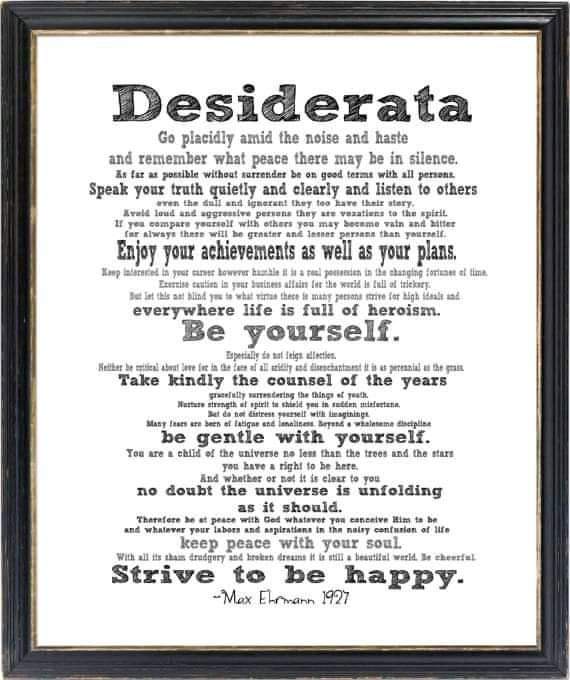 GO PLACIDLY amid the noise and the haste, and remember what peace there may be in silence. As far as possible, without surrender, be on good terms with all persons. Speak your truth quietly and clearly; and listen to others, even to the dull and the ignorant; they too have their story. Avoid loud and aggressive persons; they are vexatious to the spirit. If you compare yourself with others, you may become vain or bitter, for always there will be greater and lesser persons than yourself. Enjoy your achievements as well as your plans. Keep interested in your own career, however humble; it is a real possession in the changing fortunes of time. Exercise caution in your business affairs, for the world is full of trickery. But let this not blind you to what virtue there is; many persons strive for high ideals, and everywhere life is full of heroism. Be yourself. Especially do not feign affection. Neither be cynical about love; for in the face of all aridity and disenchantment, it is as perennial as the grass. Take kindly the counsel of the years, gracefully surrendering the things of youth. Nurture strength of spirit to shield you in sudden misfortune. But do not distress yourself with dark imaginings. Many fears are born of fatigue and loneliness. Beyond a wholesome discipline, be gentle with yourself. You are a child of the universe no less than the trees and the stars; you have a right to be here. And whether or not it is clear to you, no doubt the universe is unfolding as it should. Therefore be at peace with God, whatever you conceive Him to be. And whatever your labors and aspirations, in the noisy confusion of life, keep peace in your soul. With all its sham, drudgery and broken dreams, it is still a beautiful world. Be cheerful. Strive to be happy.