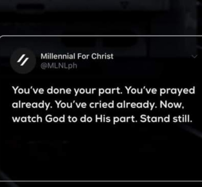Kapag alam mong ginawa mo na lahat ng dapat mong gawin o kung ano yung part mo. Tahan na, at maniwala ka sa biyaya ng panginoon Ama. Lahat tayo naririnig niya at nakikita. Dumanas man tayo ng pagsubok sa buhay. Minsan it is just his way to test us kung gaano katatag at kalalim ang ating paniniwala sa kanya. Manalig ka at dika pababayaan. Magtiwala ka at makikita mo ang tamang daan na dapat tahakin. Have faith in him, and follow his way. One day makikita mo at malalaman kung ano mga sagot sa mga tanong mo noon. At kung ano dahilan ng mga nangyari sa buhay. God bless all of us. Source: Photo Credits to Millenial for Christ; no copyright infringement intended