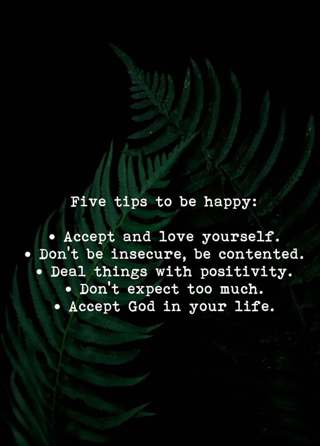 Allow yourself to seek happiness in simple things. Accept your flaws, your mistakes, your imperfection. No one should validate your worth as a person. Be contented to whatever achievements you have reached. Do not compare your victories from others. Always look at the silver lining. You do not know what the future holds, so just keep smiling. Accept God in your life. There you would know how He works for your life.