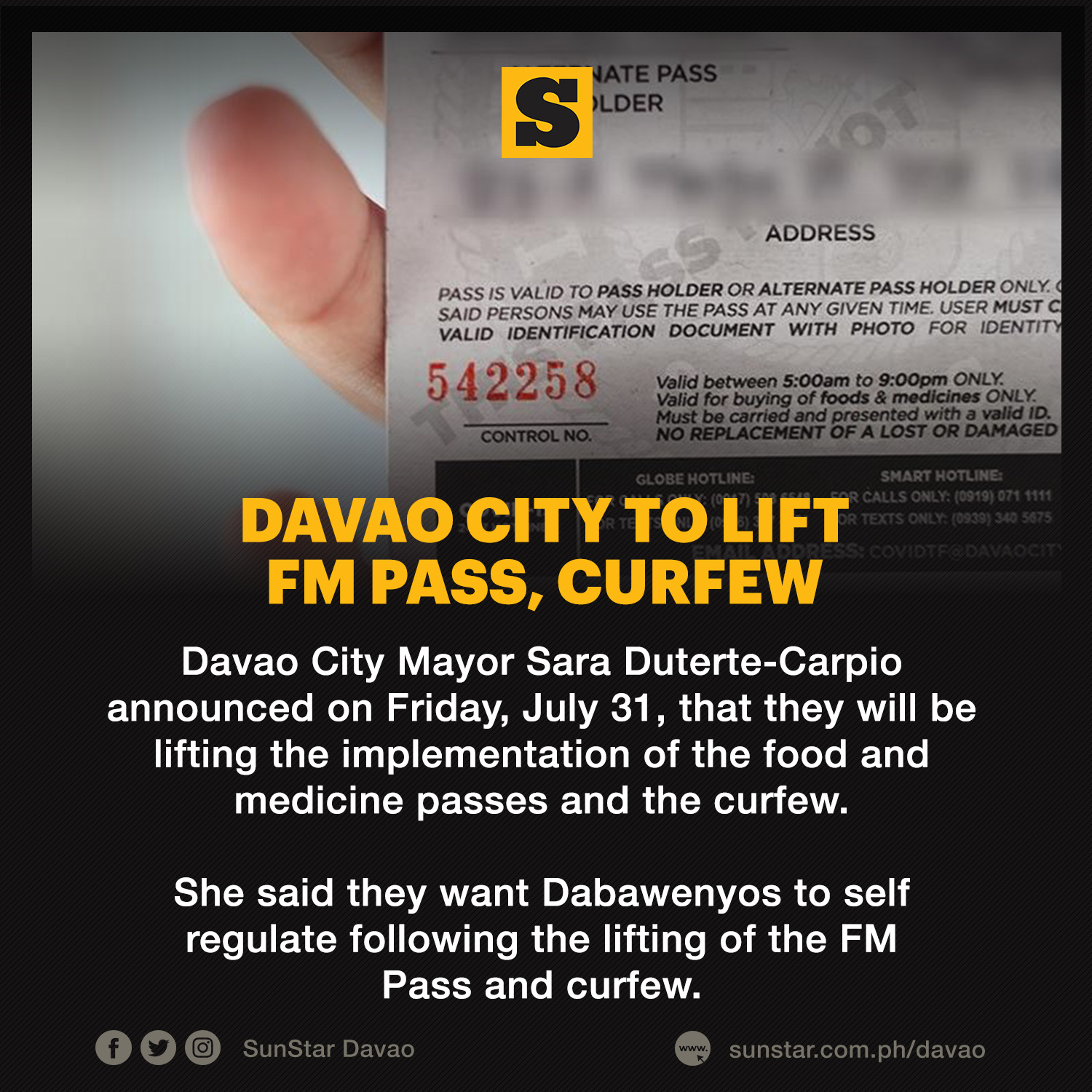 As we all know, we have so much encountered this pandemic which is really affects us this year. But, Mayor Inday Sarah Duterte-Carpio announced that they will be lifting the implementation of the Food and Quarantine Pass and also the curfew. But furthermore, she said that all Dabawenyos must have the Self-Regulate so that they will be always aware of the virus that we have facing right now.