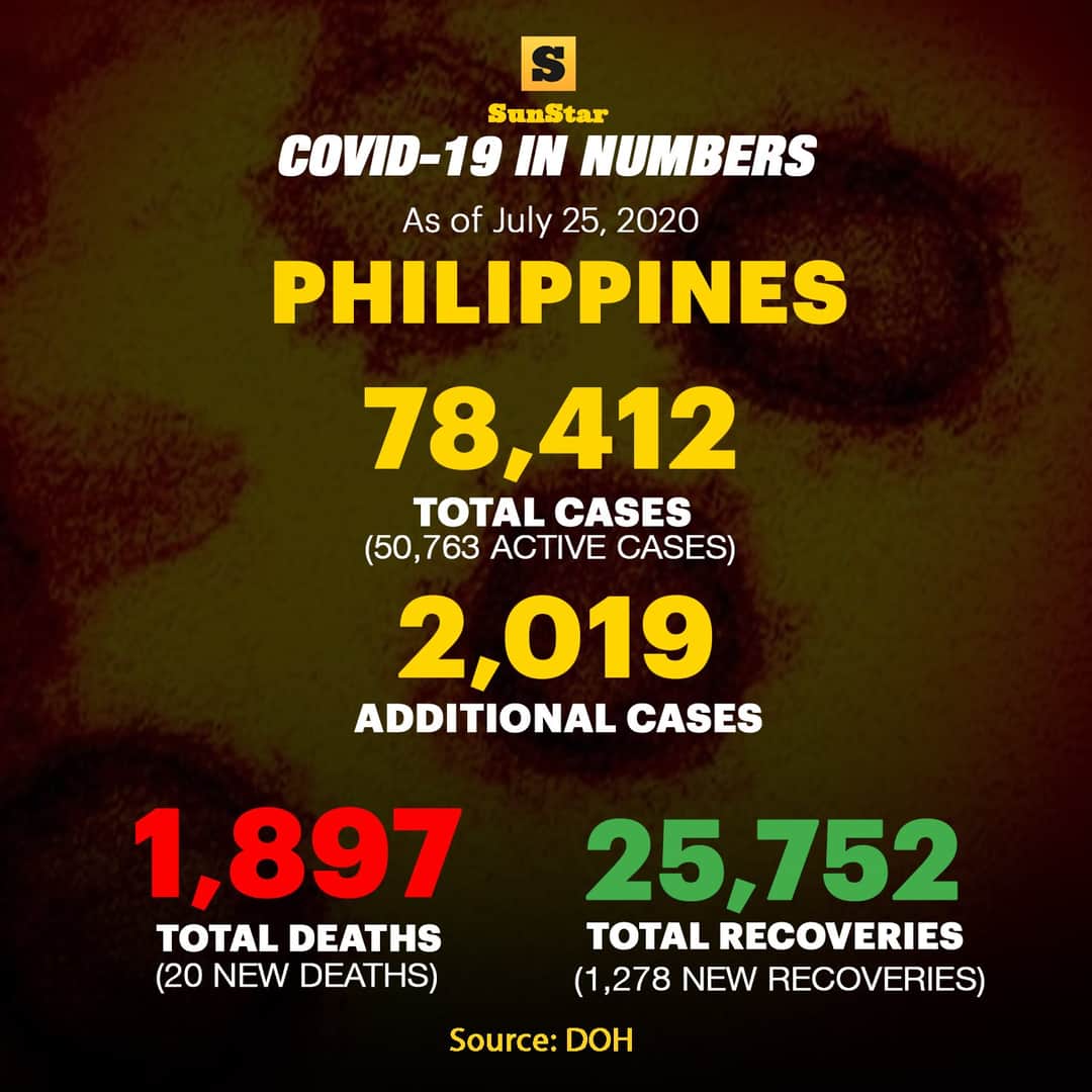 The Philippines Health Department reported 2,019 additional cases of coronavirus on Saturday , July 25, 2020, bringing the total number of cases in the country to 78, 412. TWO THOUSAND NINETEEN Not the year, but the total number of additional Covid-19 cases reported today, July 25, 2020, by the Department of Health Philippines. These are the areas in the country with the highest number of recorded cases: NCR (1,115); Cebu (479); Cavite (90); Rizal (52); Davao del Sur (41). Reference: DOH PH