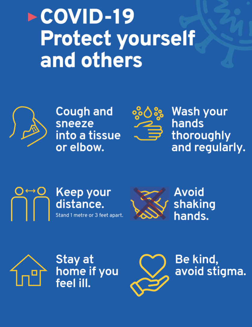 Know how it spreads There is currently no vaccine to prevent coronavirus disease 2019 (COVID-19). The best way to prevent illness is to avoid being exposed to this virus. The virus is thought to spread mainly from person-to-person. Between people who are in close contact with one another (within about 6 feet). Through respiratory droplets produced when an infected person coughs, sneezes or talks. These droplets can land in the mouths or noses of people who are nearby or possibly be inhaled into the lungs. Some recent studies have suggested that COVID-19 may be spread by people who are not showing symptoms. Everyone Should Wash your hands often Wash your hands often with soap and water for at least 20 seconds especially after you have been in a public place, or after blowing your nose, coughing, or sneezing. It’s especially important to wash: Before eating or preparing food Before touching your face After using the restroom After leaving a public place After blowing your nose, coughing, or sneezing After handling your cloth face covering After changing a diaper After caring for someone sick After touching animals or pets If soap and water are not readily available, use a hand sanitizer that contains at least 60% alcohol. Cover all surfaces of your hands and rub them together until they feel dry. Avoid touching your eyes, nose, and mouth with unwashed hands. Avoid close contact Inside your home: Avoid close contact with people who are sick. If possible, maintain 6 feet between the person who is sick and other household members. Outside your home: Put 6 feet of distance between yourself and people who don’t live in your household. Remember that some people without symptoms may be able to spread virus. Stay at least 6 feet (about 2 arms’ length) from other people. Keeping distance from others is especially important for people who are at higher risk of getting very sick. Cover your mouth and nose with a cloth face cover when around others You could spread COVID-19 to others even if you do not feel sick. The cloth face cover is meant to protect other people in case you are infected. Everyone should wear a cloth face cover in public settings and when around people who don’t live in your household, especially when other social distancing measures are difficult to maintain. Cloth face coverings should not be placed on young children under age 2, anyone who has trouble breathing, or is unconscious, incapacitated or otherwise unable to remove the mask without assistance. Do NOT use a facemask meant for a healthcare worker. Currently, surgical masks and N95 respirators are critical supplies that should be reserved for healthcare workers and other first responders. Continue to keep about 6 feet between yourself and others. The cloth face cover is not a substitute for social distancing. Cover coughs and sneezes Always cover your mouth and nose with a tissue when you cough or sneeze or use the inside of your elbow and do not spit. Throw used tissues in the trash. Immediately wash your hands with soap and water for at least 20 seconds. If soap and water are not readily available, clean your hands with a hand sanitizer that contains at least 60% alcohol. Clean and disinfect Clean AND disinfect frequently touched surfaces daily. This includes tables, doorknobs, light switches, countertops, handles, desks, phones, keyboards, toilets, faucets, and sinks. If surfaces are dirty, clean them. Use detergent or soap and water prior to disinfection. Then, use a household disinfectant. Most common EPA-registered household disinfectantsexternal icon will work. Monitor Your Health Daily Be alert for symptoms. Watch for fever, cough, shortness of breath, or other symptoms of COVID-19. Especially important if you are running essential errands, going into the office or workplace, and in settings where it may be difficult to keep a physical distance of 6 feet. Take your temperature if symptoms develop. Don’t take your temperature within 30 minutes of exercising or after taking medications that could lower your temperature, like acetaminophen.