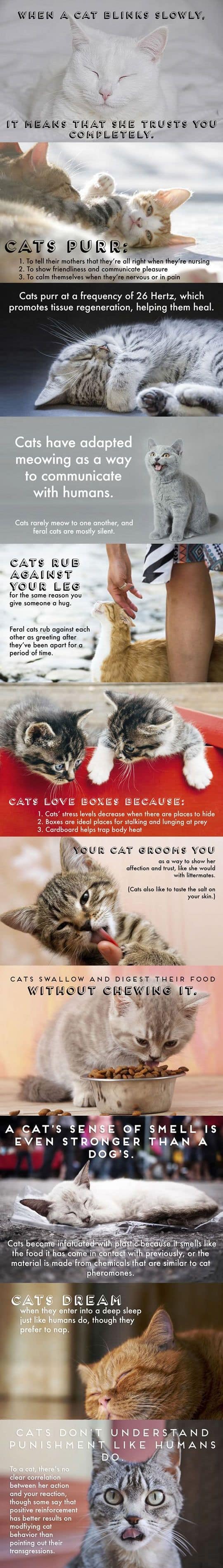 Cat behavior is many and varied and if you would like to know your feline better, this guide will help you decode their moves and expressions. If you are a Cat Owner, you will love learning how to understand your cat’s behavior. When you know how they feel, you can recognize when they are anxious and also ready for cuddles, kisses, and food. You will be able to enjoy a much better relationship with your furbaby when you know how to decode their behavior. You may also be interested to know that they can see in the dark and they have an ultrasonic hearing. This is the way rodents communicate. Another handy tip to know is if your cat gets lost, leave their kitty litter out the front on the porch. They will be able to smell from a mile away and find their way home. A happy cat will be relaxed with its tail up. Their ears will be in a natural position. The tip of the tail may be slightly curved and the cat’s mouth will be closed. If your cat is stretched out and lying down, this is another sign of contentment. The more relaxed, the happier your cat is. CATTITUDES - CAT BEHAVIOR DECODED In contrast, if your cat is hiding or sitting in a crouched position and exhibiting tenseness, this is a classic sign of a worried cat. Their pupils will be dilated also. When your cat lies down and flattens their body they may be exhibiting signs of anger or unhappiness. This is a very handy chart. Cats convey a whole range of emotions through their tails too. When they are overjoyed their tail will be straight up in the air. When they are in a friendly mood it will have a slight curve and when they are swishing it from side to side they are agitated and annoyed. If they are angry it will bristle. CAT INTERACTION WITH HUMANS Cats love to interact with humans and they show their affection in all sorts of ways. When a cat rubs up against you, he is marking his territory and saying that you are his property. If your cat tries to eat your hair, he is cleaning you and it’s another sign of love and affection. When your cat licks you, it’s another sign that you are trusted and part of the family. CAT’S FACIAL EXPRESSION When they are scared, they will tuck their tail under their hind legs and when they are content, they will have their tail sitting out behind them. Their Ears, Eyes, and Whiskers also are key indicators as you can see from the infographic above. When your cat Meows, they are trying to communicate. When they blink slowly, they are showing that they trust you completely. Cats also swallow and digest their food without chewing. ANXIETY IN CATS Cats can also suffer anxiety. Spraying (urinating), pacing and grooming their fur to the point that the fur rubs off are common signs that your Cat may be stressed. They can also suffer from separation anxiety when you are not around. CAT CHEAT SHEET One of your cat’s favorite things is to be patted. The infographic above shows you where they love it most. Giving them a nice head massage is awesome and don’t forget to scratch behind the ears. It’s one of their favorite spots. CAT AGE Ever wondered how old your Cat is in human years? I have also included a helpful infographic below that shows you from kitten to senior citizen. Your cat is considered in their prime in the 3-6 year range which is 28-40 in human years.
