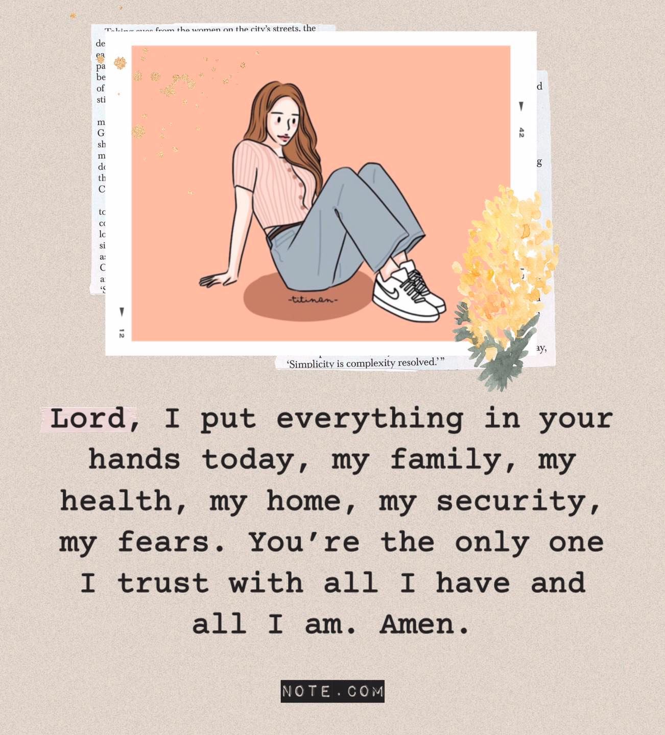 Lord, I put everything in your hands today, my family, my health, my home, my security, my fears. You’re the only one I trust with all I have and all I am. Amen.