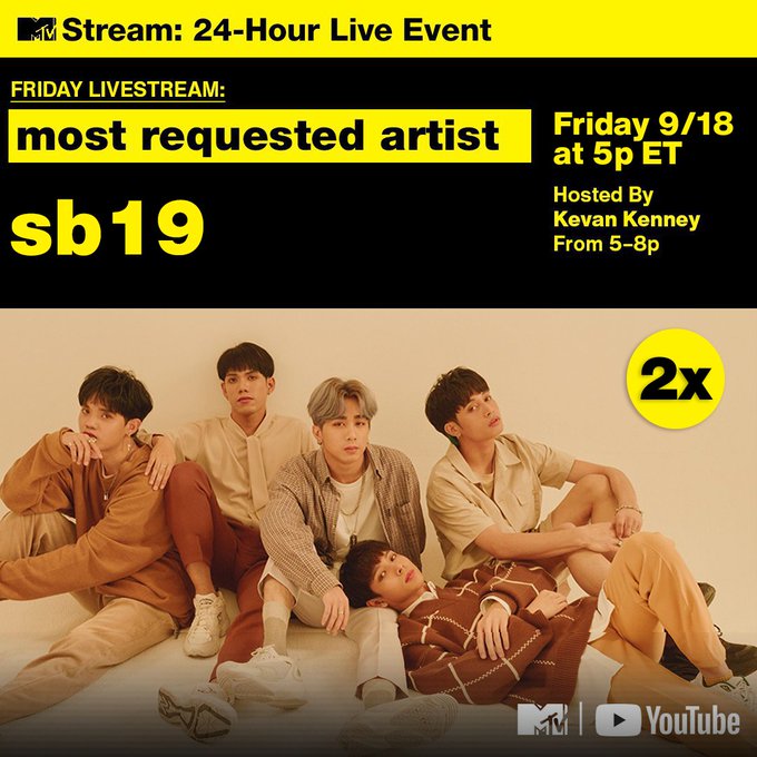 . @SB19Official now holds the title of Most Requested Artist on the @MTV #FridayLivestream for the second week in a row. © @kevankenney follow #SB19 on sns accounts @sb19official