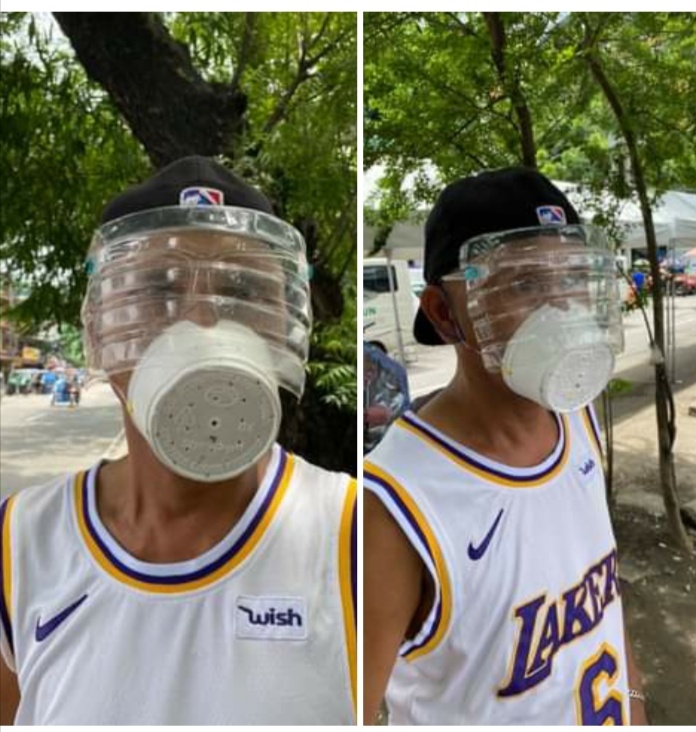 LOOK: Tricycle driver Nestor Lazaro in Manila wears an improvised face mask made from a styropor container and face shield made from a water container. This is in compliance with government’s memorandum requiring not just passengers but also drivers and conductors of PUVs to wear face shields.