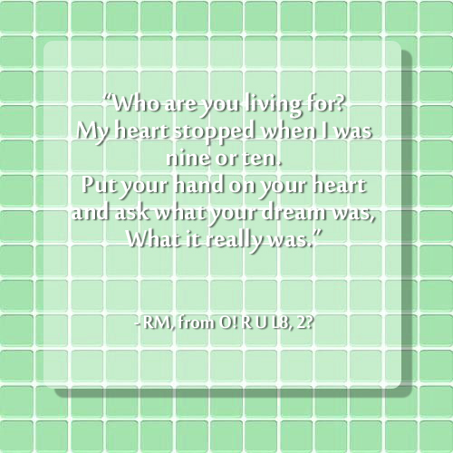 “Who are you living for? My heart stopped when I was nine or ten. Put your hand on your heart and ask what your dream was, What it really was.” - RM, from O! R U L8, 2? There are people who can determine their goals and dreams at a very young age. While some can't, some don't mind. But no one knows what's going to happen. We don't know the path we want to walk on, or the future we wish to see. Ask yourself, who am I? What is my dream? Only you has the answer. Only you can decide for yourself.