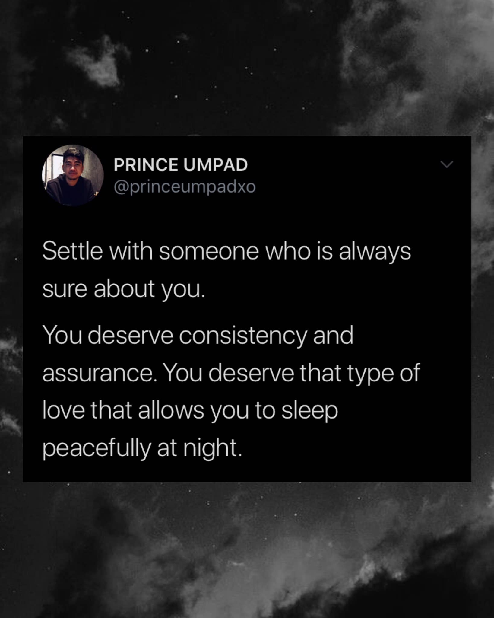 Wala nang mas sasarap sa pag ang isang tao ang may tinatawag na peace of mind especially sa kanyang partner. Yung tipong pareho kayong marunong mag bilang na sa isang relasyon dapat dalawang tao lang ang involve. Tapos kayong tutulugan nyo ang isa't isa na mag grow. Sobrang sarap sa feeling